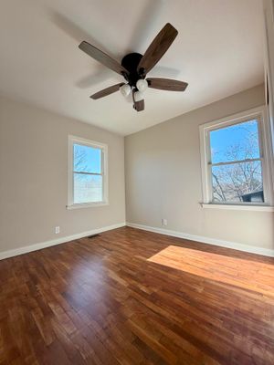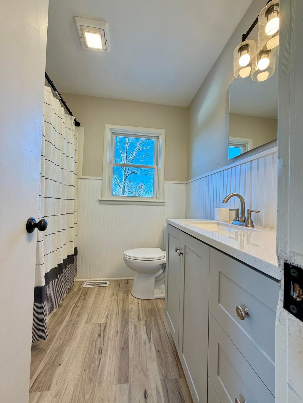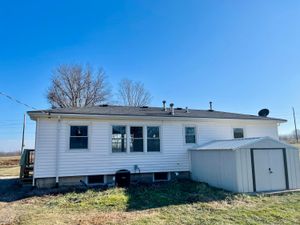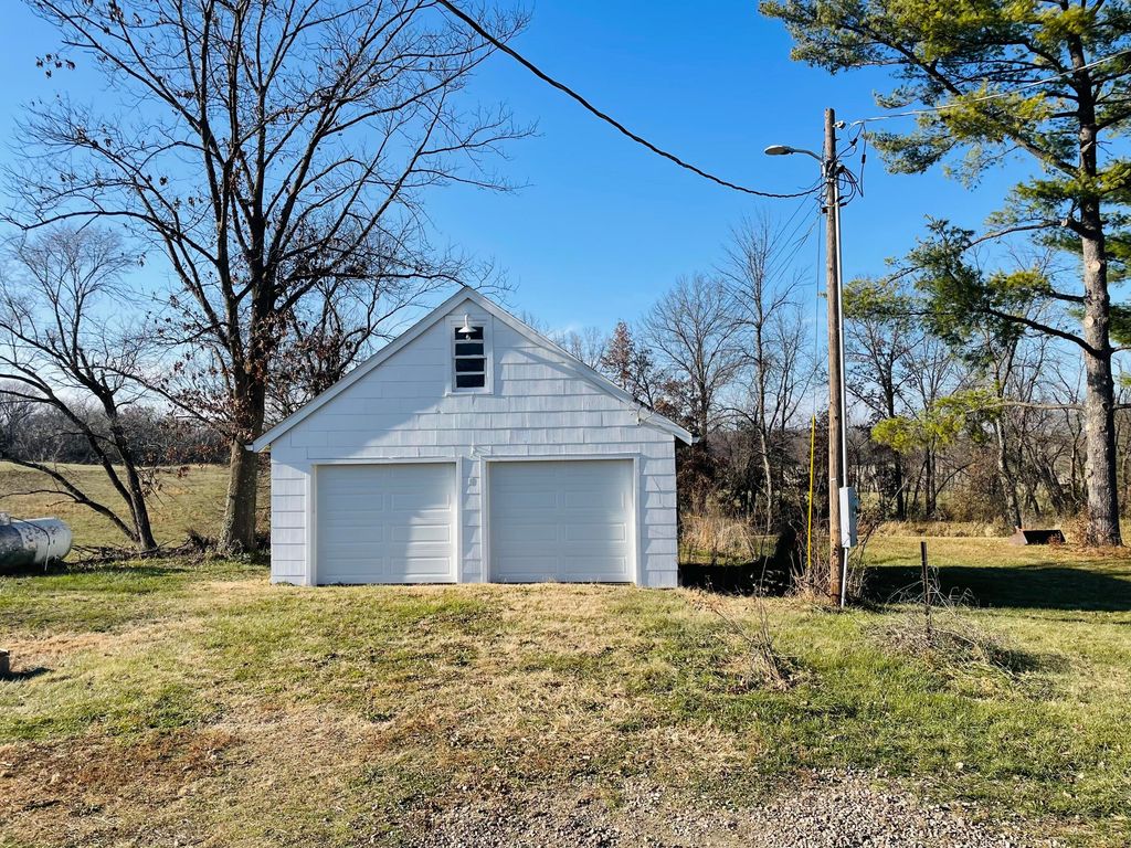 Country location with farmland and creek bottom views. Remodeled in 2024. Hardwood floors restored, new kitchen cabinets, counters, floors and appliances. New deck on side entry. Clean, painted basement for additional storage. Large 2 car garage with electric, work benches, loft space and new doors.