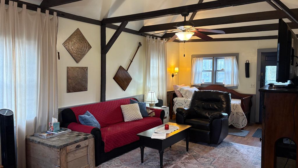 Step into the historic charm and character of small-town living at 602 High St. in historic Arrow Rock. It is nestled in one of Missouri's most picturesque villages, which is home to the Arrow Rock Lyceum Theatre. This inviting cedar-sided cottage offers timeless appeal with the comfort of everyday living. It is furnished and move-in ready, with 1 bedroom, a spacious living room with a vaulted ceiling, a fully equipped kitchen, and a full bath. Additional amenities include central air, front & back decks, a firepit & a double lot--perfect for relaxing and entertaining. Sellers state the property has been a popular vacation rental when they are not in residence.Whether you want a full-time residence, weekend getaway, or investment, this property places you right in the cent